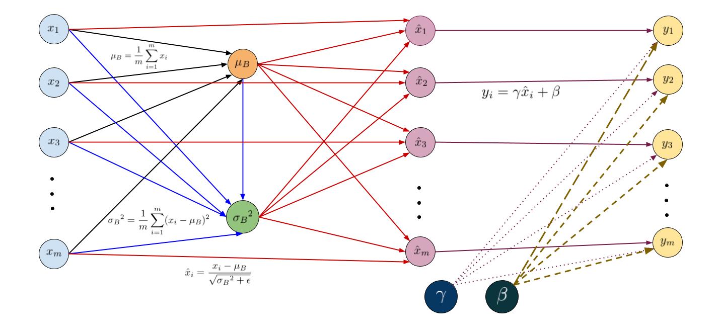 The figure given below illustrates the transformation of our inputs using a computational graph. For simplicity, we have shown the normalization of just one feature (thus dropping the superscipt \(k\)). But the idea remains the same. On left hand side are the inputs \(x_1… x_m \) to the layer (blue circles). The mean \(\mu_B\) is calculated as \(\mu_B = \frac{1}{m}\sum_{i=1}^{m}x_i \) (orange circle). Using the mean and the inputs, we compute the variance \(\sigma_B^2\) (green circle) and using inputs \(x_i\), mean \(\mu\) and variance \(\sigma_B^2\), we normalize our inputs as \(\hat{x}_i = \frac{x_i - \mu_B}{\sqrt{\sigma_B^2 + \epsilon}}\) (purple circles). The layer produces the outputs through the affine transformation \(y_i = \gamma\hat{x}_i + \beta\) (yellow circles).