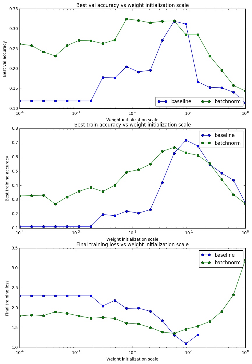 As we can see, Batch Normalization helps in faster convergence and allows less dependence on weight initialization. But there is a sweet spot at which Batch Normalization gives considerably high accuracy. Before training a neural network, proper weight scale can be estimated by running an experiment with similar setup. As the last plot suggests, without Batch Normalization the network breaks at large weight initialization scale, (may be due to lack of numerical stability), but Batch Normalization still gives some training loss.